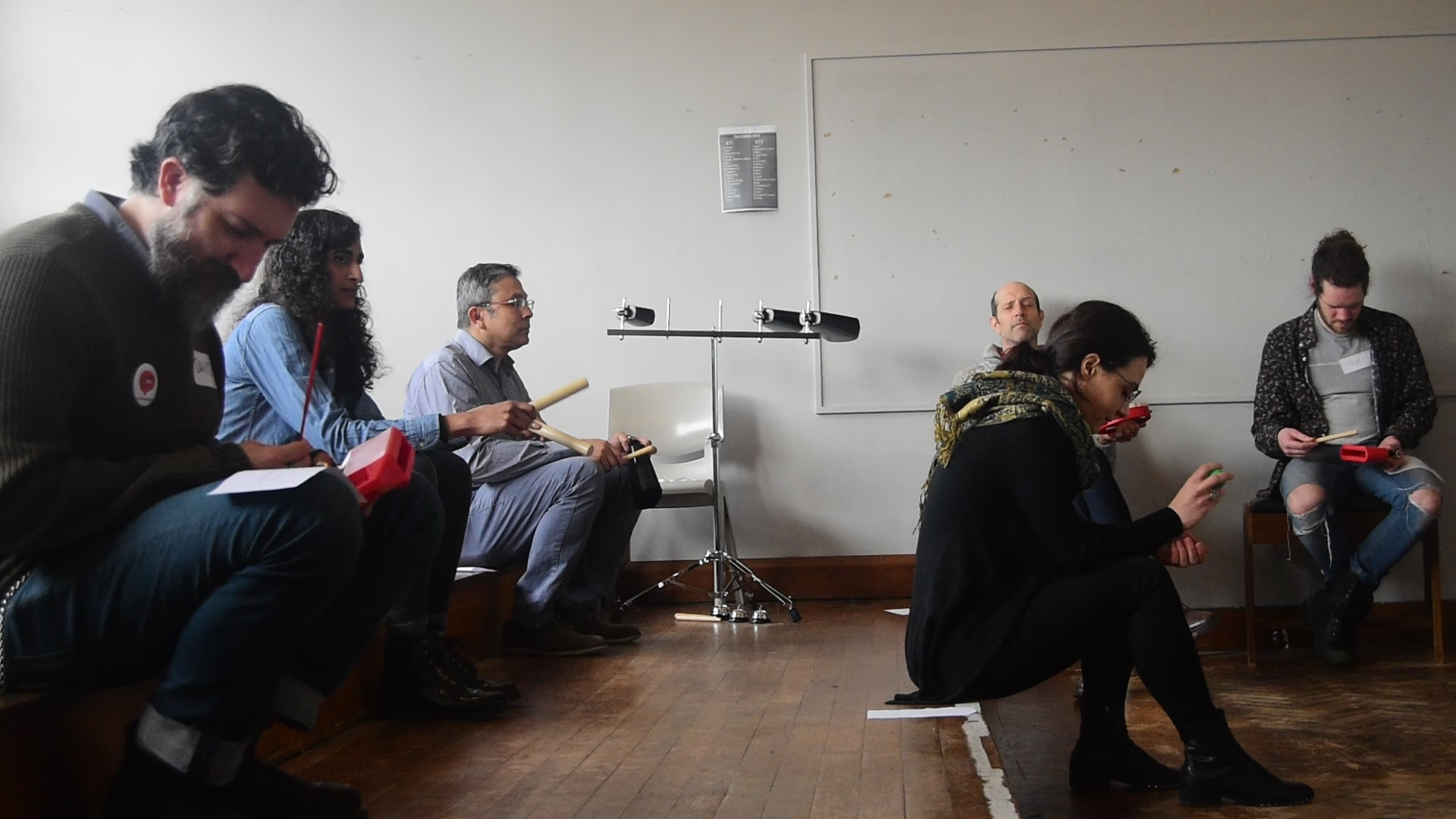 Over 3 months, we explored ideas of game and instructional scores, developing ideas that fed towards my composition of new pieces at the end of the workshop series. This ranged from using tight, synchronised counting games as a point of departure for improvisation, graphical pattern notation and rule-based cueing strategies.